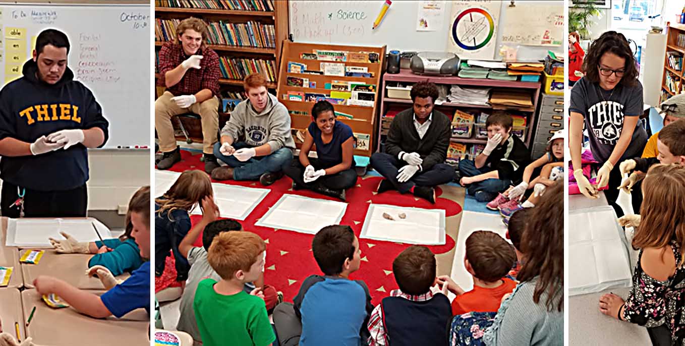 Over the past two weeks, Thiel students have been developing their own presentational skills as they teach neuroanatomy to third-graders at Greenville Elementary. The students from NSCI 101: The College Brain first created models of human brains to develop their own knowledge of neuroanatomy. They then used those models to teach the third-graders the names and functions of six brain structures. The following week, the students returned with a lesson using sheep brains to reinforce the information. Over the next month, the elementary students will build his/her own brain models in their science technology engineering arts and math class.