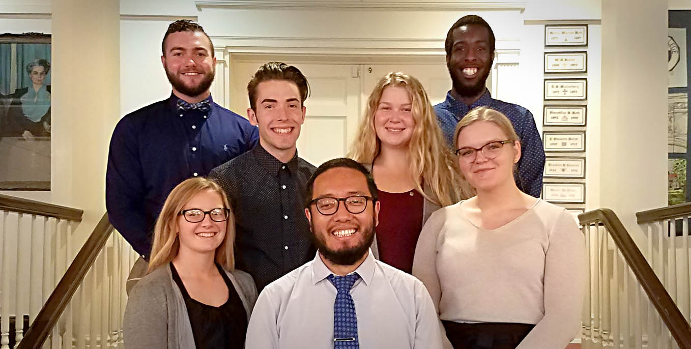 Pictured front (L-R) Breanna Mesich ’20, Tenzin Kunkhyen, Ph.D. ’07 and Lexxie Helbig ’20; back Danté Vaniel ’21, Matthew Hess ’20, Jensen Bucci ’20, D’ondre Merren ’21.