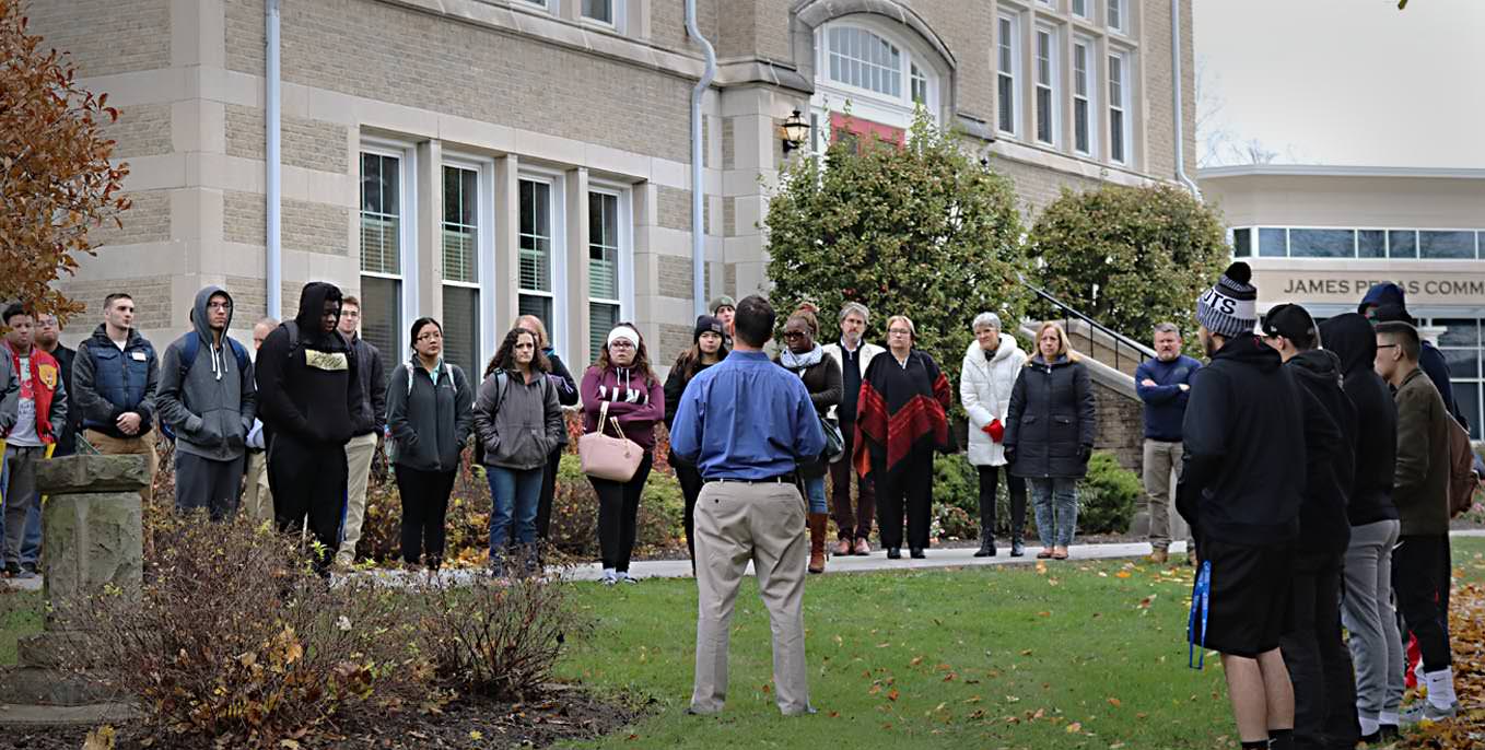 Students, faculty, staff and campus visitors participated in the rededication of the sundial near Roth Hall in recognition of Veterans Day on Monday. The sundial was originally dedicated 100 years ago to mark the passing of Thiel soldiers who perished during World War I.