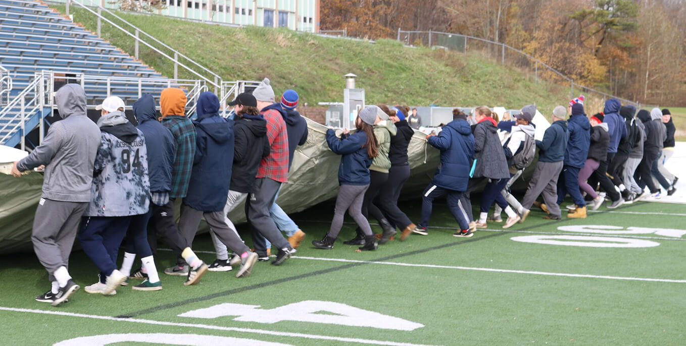 Students, faculty and staff came together to raise the Rissell-Schreyer Dome on Wednesday afternoon. Winter Fest kicks off dome season at Thiel College with a celebration with food, music, games and inflatables on Dec. 7.
