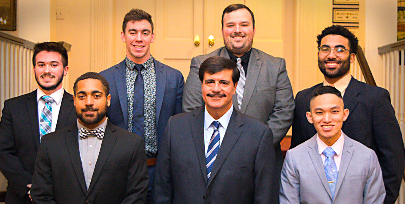 The Chi Alpha Epsilon National Honor Society inducted four new members, Brett Eckroate ’20, Jordan McCoy ’20, Camren Neal ’19 and Devan Van Vliet ’19, on March 25 in the Library’s Rare Books Room. Students were presented with a membership pin and honor cords to be worn at graduation. Current members, Zechariah Dubel ’19, Elizabeth Grasso ’19, Mariel Hanely ’19 and Jacob Morgan ’19 attended the ceremony and received a pin-upgrade honor based on their fall 2018 semester grade point average of a 3.50 and higher. Phillip Brewer ’19, Michel Duncan ’19, Corrine Hankin ’19, Megan Lee ’19, Vincent Mion ’19 and Justin Walter ’19 also earned jewel pin upgrades, but were not in attendance. Honorary members who assisted with the ceremony were Donna Barton, Nancy Katz, Noel Stanger ’07 and Diane Donnelly Eakin, who also serves as the society’s advisor.