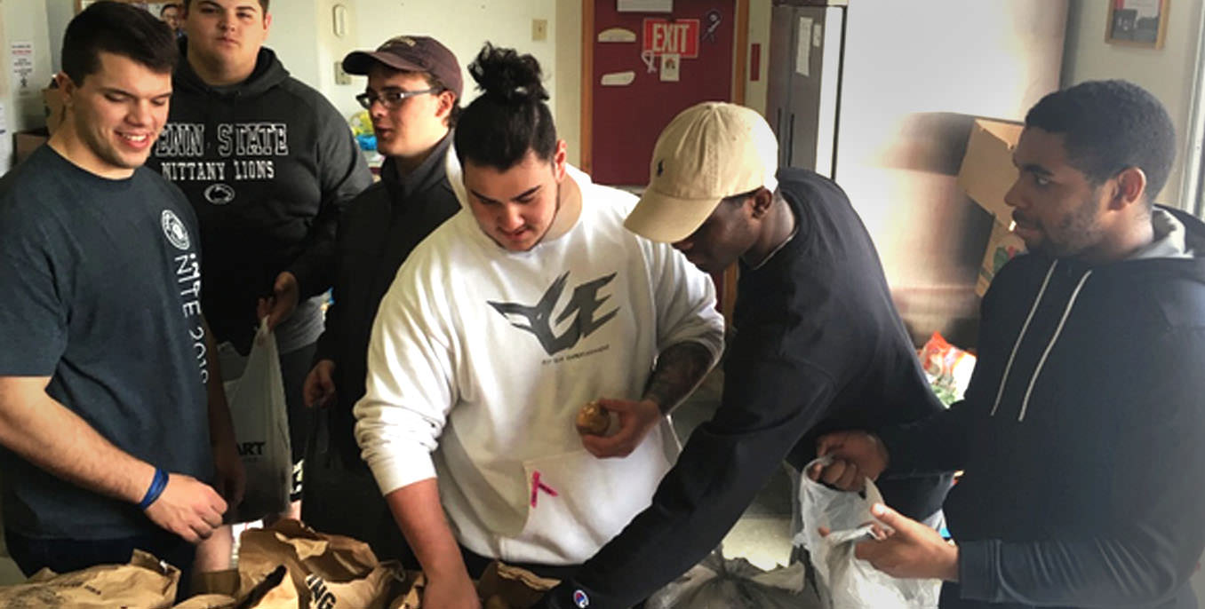 Football team members Nick Lanshcak ’21, Zach Young ’20, Dan Myers ’22, James McKinney ’22, Orlando Lucabech ’22, Larry Goines Jr. ’21 recently joined coach Andrew Geisler and Interim Campus Pastor Brian Riddle ’07 to help unload a truck laden with holiday food, all slated for Good Shepherd’s annual Easter food distribution. Good Shepherd received this special order of food, in order that it might be portioned and sent to nearly 400 families in the region. The special food shipment included traditional Easter fare of ham, yams, vegetables, bread and frozen items.