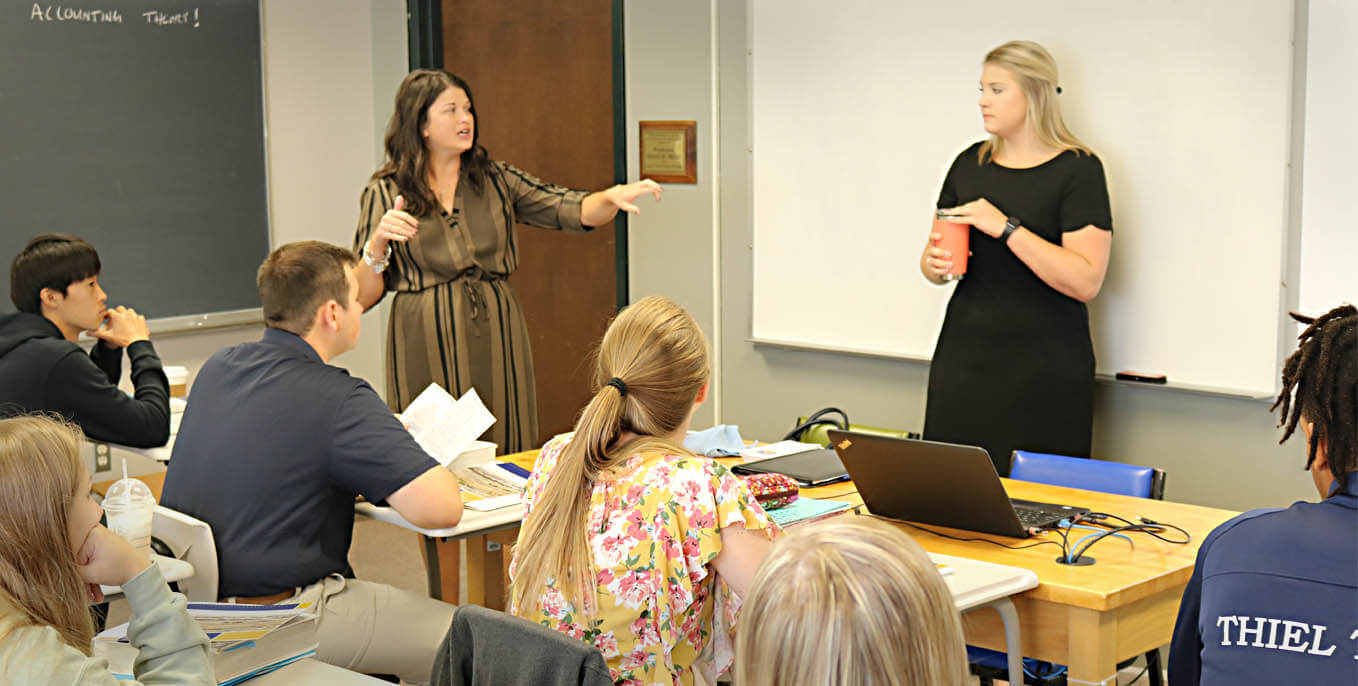 Team Leader/Auditor Department of Defense, Office of the Inspector General Loretta (Loughner) Unger ’05 (above left) and her colleague Katherine Iannone spoke to the classes of Associate Professor of Business Administration and Accounting Melissa Oakes ’03 and Professor of Business Administration and Accounting Gary Witosky ’79 Wednesday about accounting careers with the U.S. government.