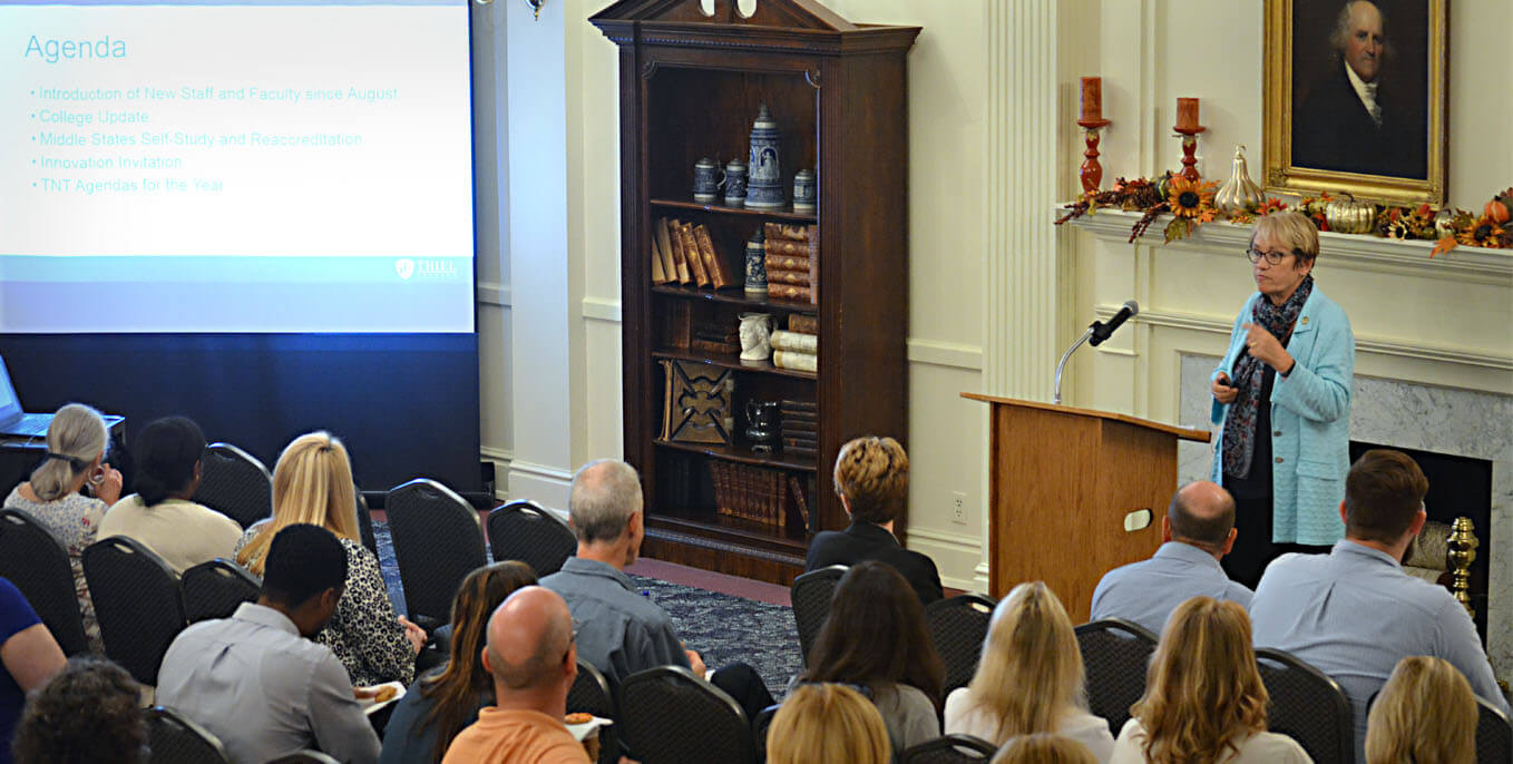 President Susan Traverso, Ph.D., Vice President for Academic Affairs and Dean of the College Liz Frombgen, Ph.D., were the primary speakers at the first campus-wide gathering of members of the faculty and staff at TNT on Tuesday, Sept. 24.