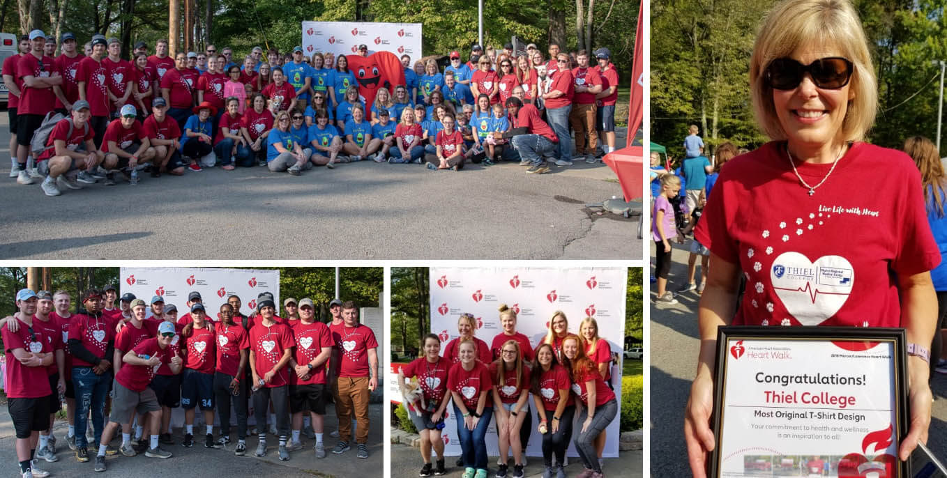 Thiel College’s Wellness Committee raised $600 for the event. Committee members said they are grateful to those who contributed to making the event a huge success! Special recognition is given to the Zeta Tau Alpha sorority and T.J. Bardsley and the men’s lacrosse team for their participation. Thiel College was recognized for its large team and was awarded a certificate for the “Most Original T-Shirt Design” by the American Heart Association. Jackie Kytchak in Student Life for created the t-shirts.