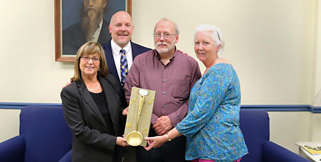 Pictured with the Golden Ladle are members of the College Advancement team (L-R) Cindy McClelland, Mark Batt ’87, David Hummel ’83 and Paula Jaillet. Not pictured are Roberta Leonard, Anna Mary Hoovler, Mario Marini ’91 and Ava Park ’22.