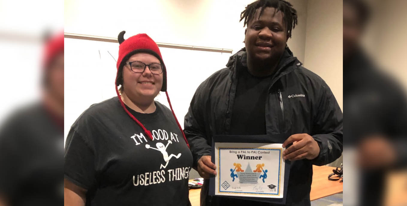 Supplemental Instruction leader Sarah Ford ’21 presents Alrick Francis ’22 with the Bring a PAL to PAL award. Alrick won the contest and a Sheetz gift card for bringing the most classmates to his macroeconomics supplemental instruction sessions.