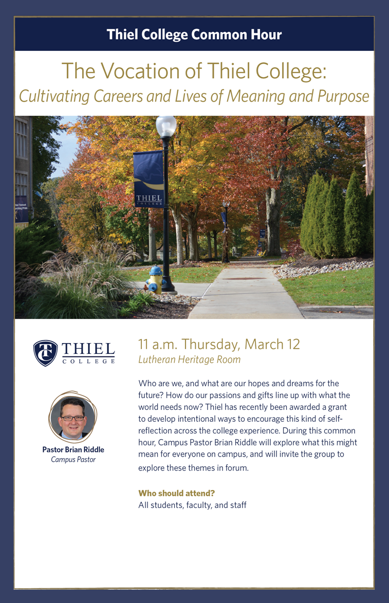 T-Notes is published weekly during the academic year. It arrives Wednesday afternoons. The next edition will be out March 18, 2020. Send your event or news to tnotes@thiel.edu by noon Monday, March 16 to be published in that week’s edition.