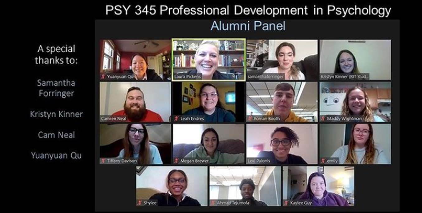 Samantha Forringer ’17, Kristyn Kinner ’19, Cam Neal ’19, Yuanyuan Qu ’19 attended an online alumni panel recently for psychology students.