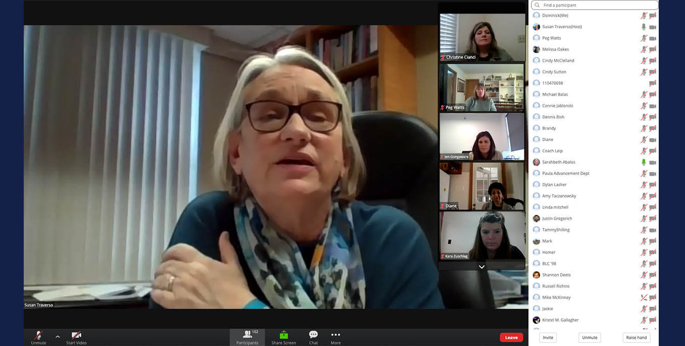 President Susan Traverso, Ph.D. gave brief updates on campus construction and answered an array of questions on the return of students to campus during the second Thiel News Time of the spring semester and the first since the start of classes. Vice President for Student Life and Dean of Students Mike McKinney ’02 and Vice President for Academic Affairs and Dean of the College Liz Frombgen, Ph.D. also gave short updates.