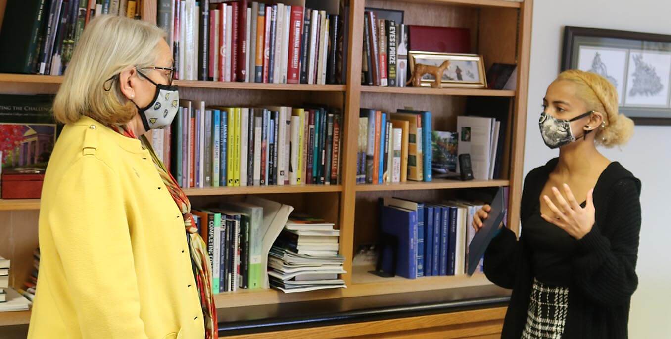 The online celebration for the third annual Thiel College Martin Luther King Jr. award celebration was held on Feb. 18. On Wednesday, Stacy Reecks ’21 stopped by the office of President Susan Traverso, Ph.D., to get a photo with her certificate. Reecks is the president of the Organization for Black Collegiates. The two spoke following the photo about upcoming diversity and inclusion plans at Thiel College.