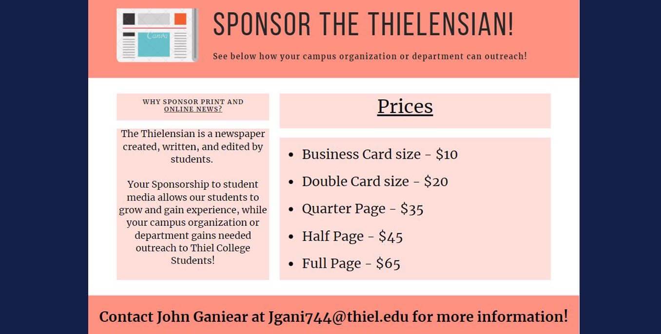 The Thielensian is looking for sponsors for their online and print newspaper that will be coming out in April.