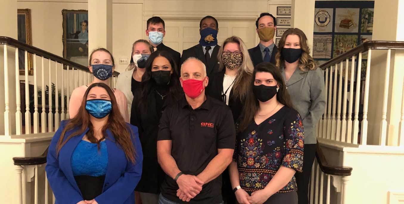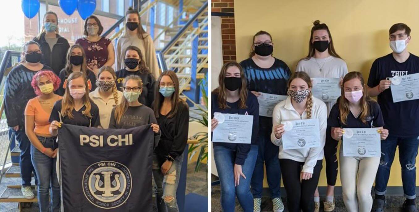 Pictured on the left are Psi Chi members present during the induction ceremony; while on the right are new members (standing) Morgan Wood ’23, Raquel McDonald ’22, Roman Booth ’22, (squatting) Michaela Brown ’22, Hallie Vogt ’23 and Jade Rhoads ’22. Not pictured are James Gilbert Jr. ’21 and Kaylee Suarez ’23.