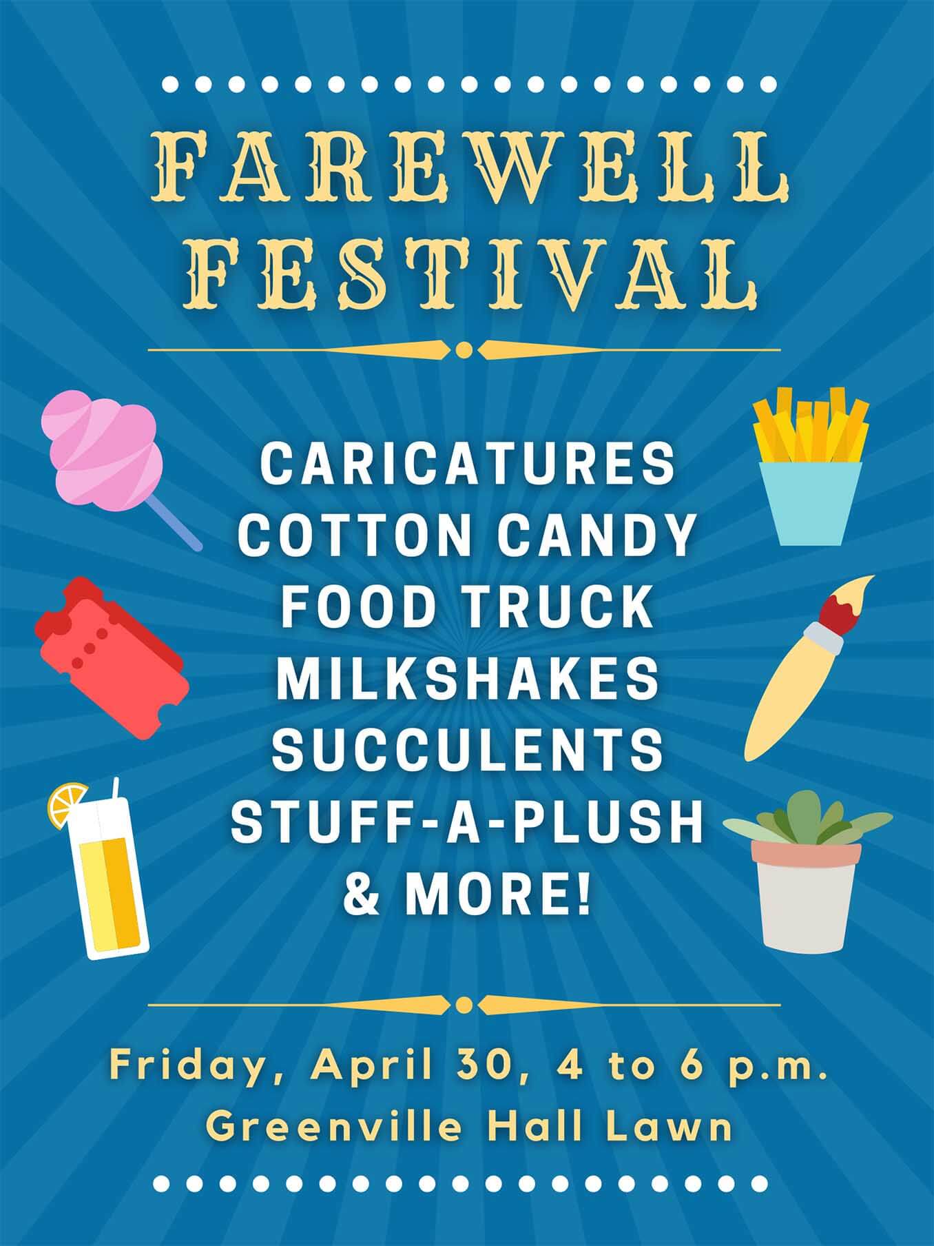 Cotton candy, food truck, succulents, stuff-a-plush and many other activities to celebrate the end of the semester.