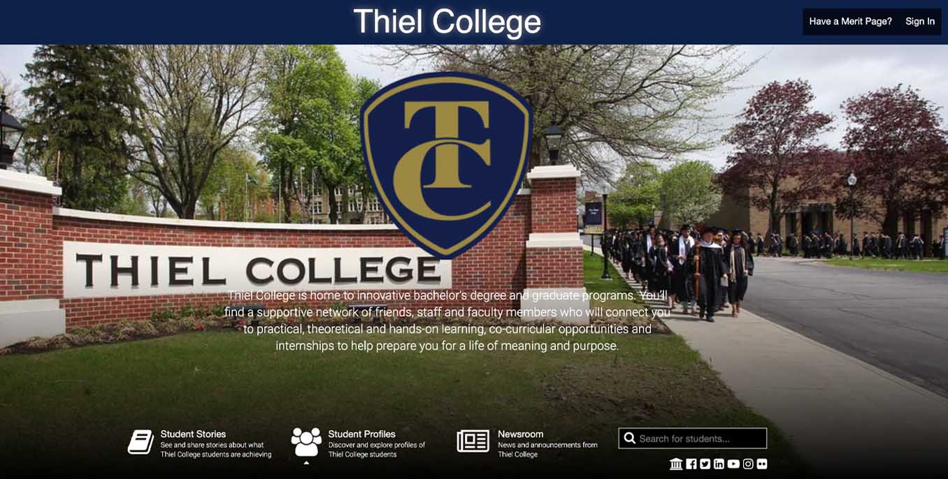 Merit is a combination social media channel and professional accomplishment aggregator. It is both passive and active. The service accumulates and distributes student news and achievement. It will send updates to local government representatives, high school guidance counselors, hometown newspapers and student-identified family members. Students can curate and take ownership of these Merit profiles and fill them out with personal information. A student’s Thiel email is used to verify their account.
