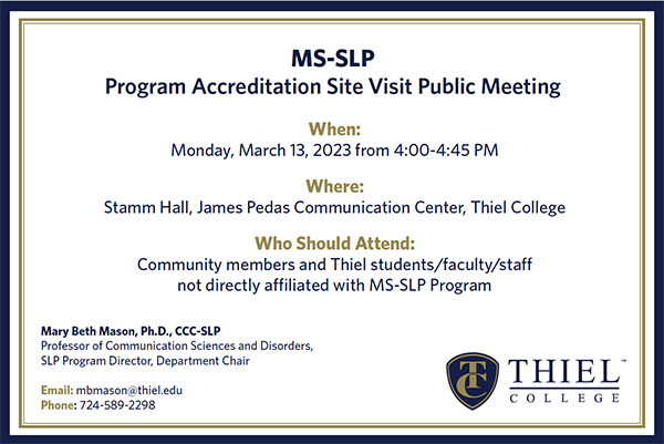Thiel College’s Master of Science in Speech-Language Pathology Program Site Visit for full accreditation from the Council on Academic Accreditation is scheduled for Monday, March 13 and Tuesday, March 14.