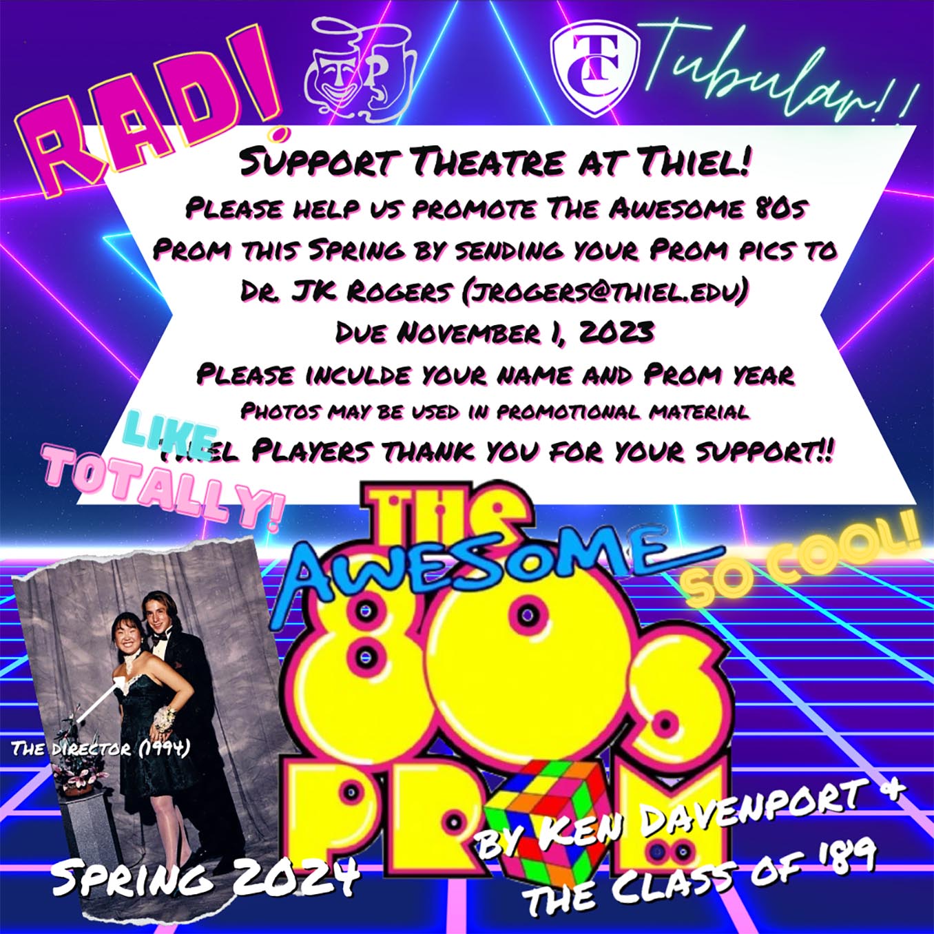 Auditions for the Spring production of “The Awesome 80s Prom” by Ken Davenport and the Class of '89 will be at 7 p.m. Nov. 29-30 and at 7 p.m. Jan. 22 in the Robinson Theater.