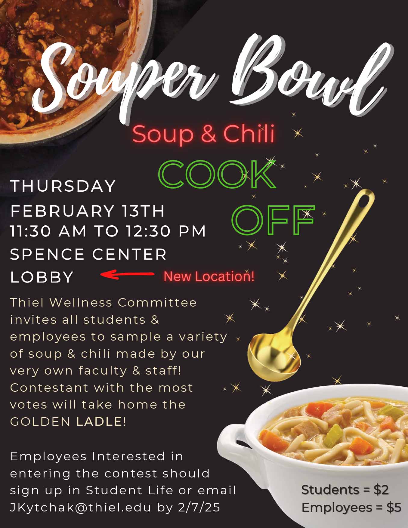 The Thiel Wellness Committee invites all students and employees to sample a variety of soup and chili made by the faculty and staff. The contestant with the most votes will take home the GOLDEN LADLE!