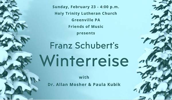 At 4 p.m. Sunday, February 23 , The Friends of Music presents Franz Schubert's Winterreise with Allan Mosher, baritone and Paula Kubik, piano. Winterreise (Winter Journey) is a song cycle of 24 poems by the German poet Wilhelm Müller.