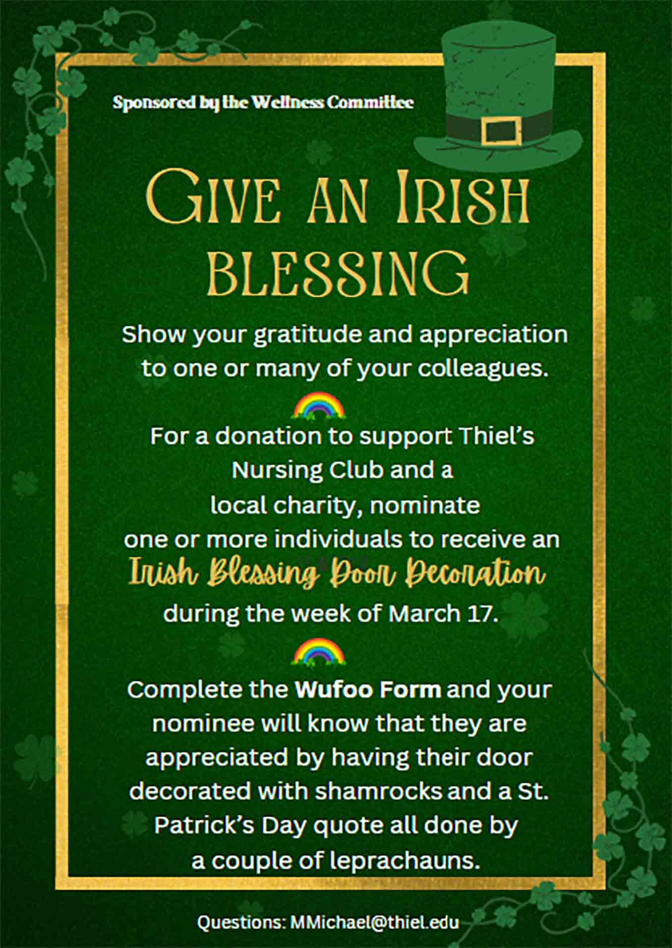 The leprechauns will be busy decorating office doors all across campus next week.🍀 Join in on the fun and spirit of St. Patrick’s Day by nominating a colleague to receive an Irish Blessing!