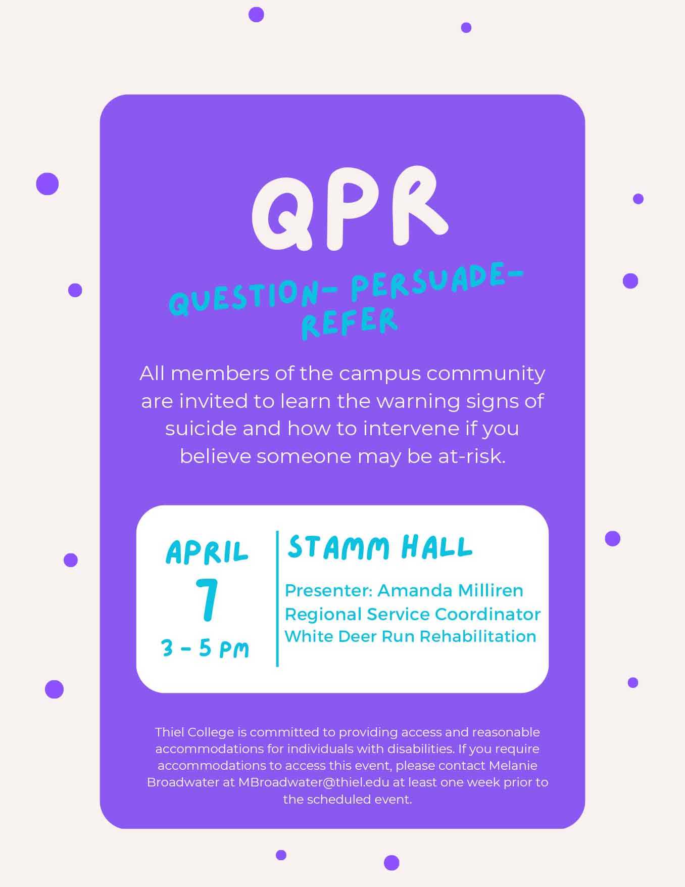 On Monday, April 7, from 3-5 p.m. in Stamm Hall of the James Pedas Communication Center, Amanda Milliren, the Regional Service Coordinator for White Deer Run Rehabilitation, will present a Question-Persuade-Refer (QPR) information session. This program aims to educate members of the campus community about the warning signs of suicide and how to intervene if you are concerned someone may be at risk.