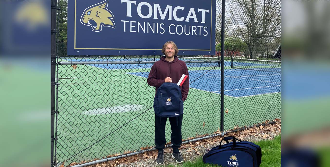 Tennis alumni continue to show strong support for the tennis program. Former No. 1 singles player and four-year captain, Elijah Flinchbaugh ’24 (seen above with new Thiel tennis team bag and backpack for the 2025-26 season), donated $1,000 in proceeds from his annual summer tennis tournament held in Oil City, Pa. to the tennis program. The contribution was used to purchase team tennis bags and backpacks for both the men’s and women’s tennis teams. Thanks, Eli!