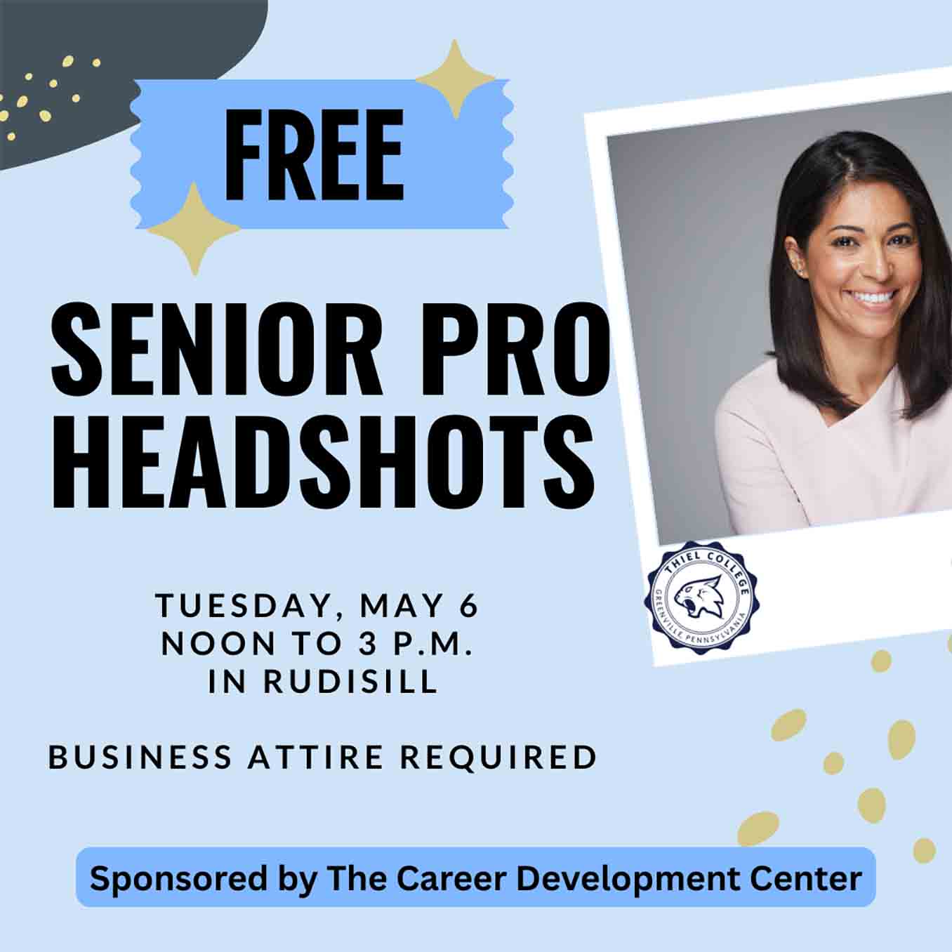 Free professional headshots for seniors. Business attire is required. This event is sponsored by the Career Development Center.