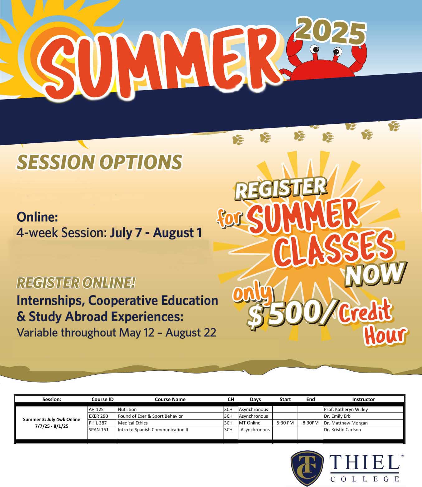 T-Notes is published on alternating Wednesdays during the summer break. It arrives Wednesday afternoons. Send your event or news to tnotes@thiel.edu by noon Monday, July 7, 2025 to be published in that week’s edition. The next edition will be published Wednesday, July 9, 2025.