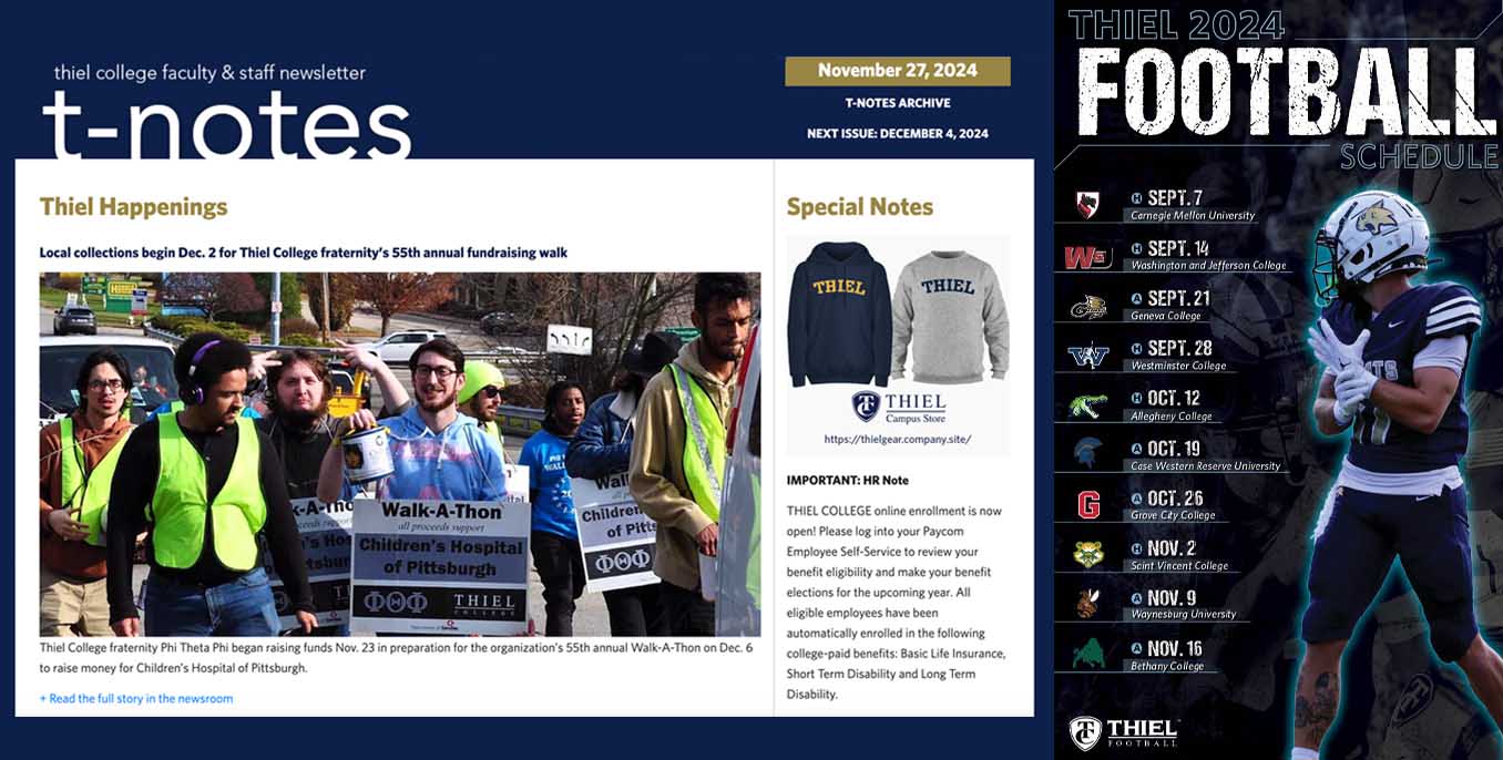 The Office of Communications and Marketing is always looking for good content that can be featured in the weekly staff newsletter (T-Notes), the student newsletter (Thiel Happenings), the website Newsroom or on social media.