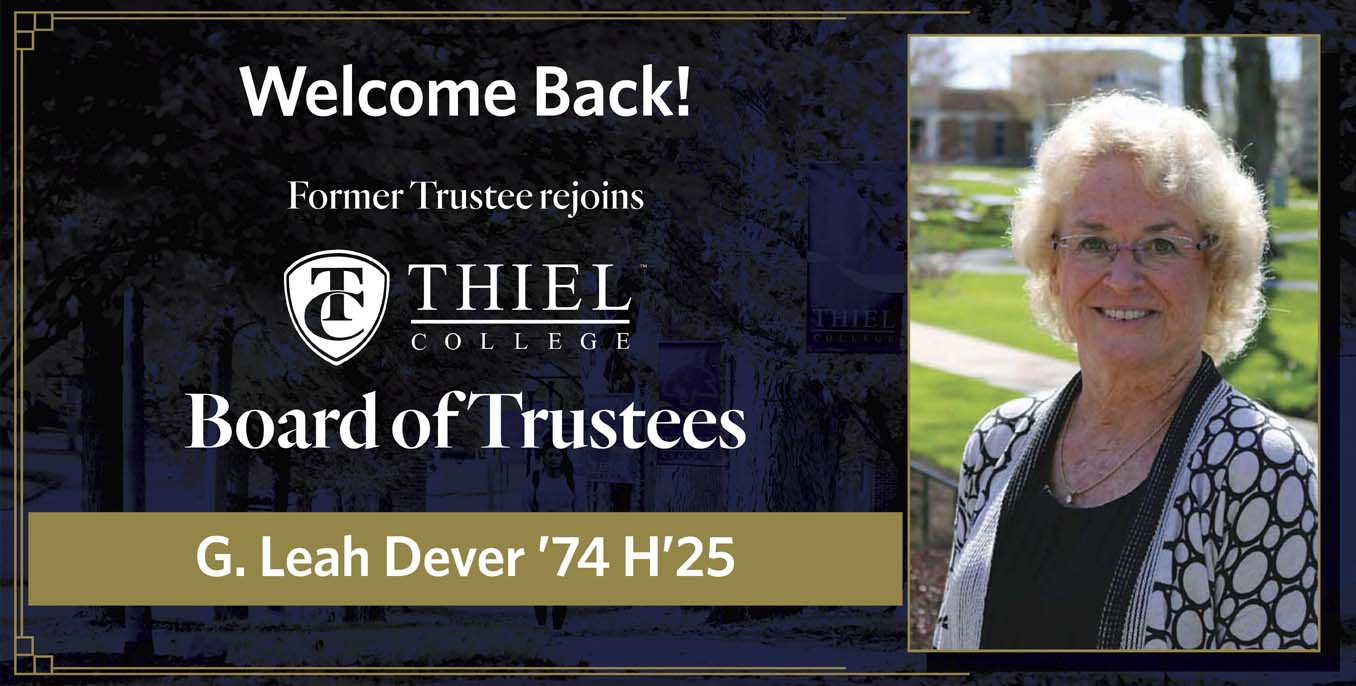 G. Leah (Glessner) Dever ’74 H’25, an enduring supporter and abiding asset to Thiel College, has been reappointed to the Board of Trustees and is set to begin her new term in November.
