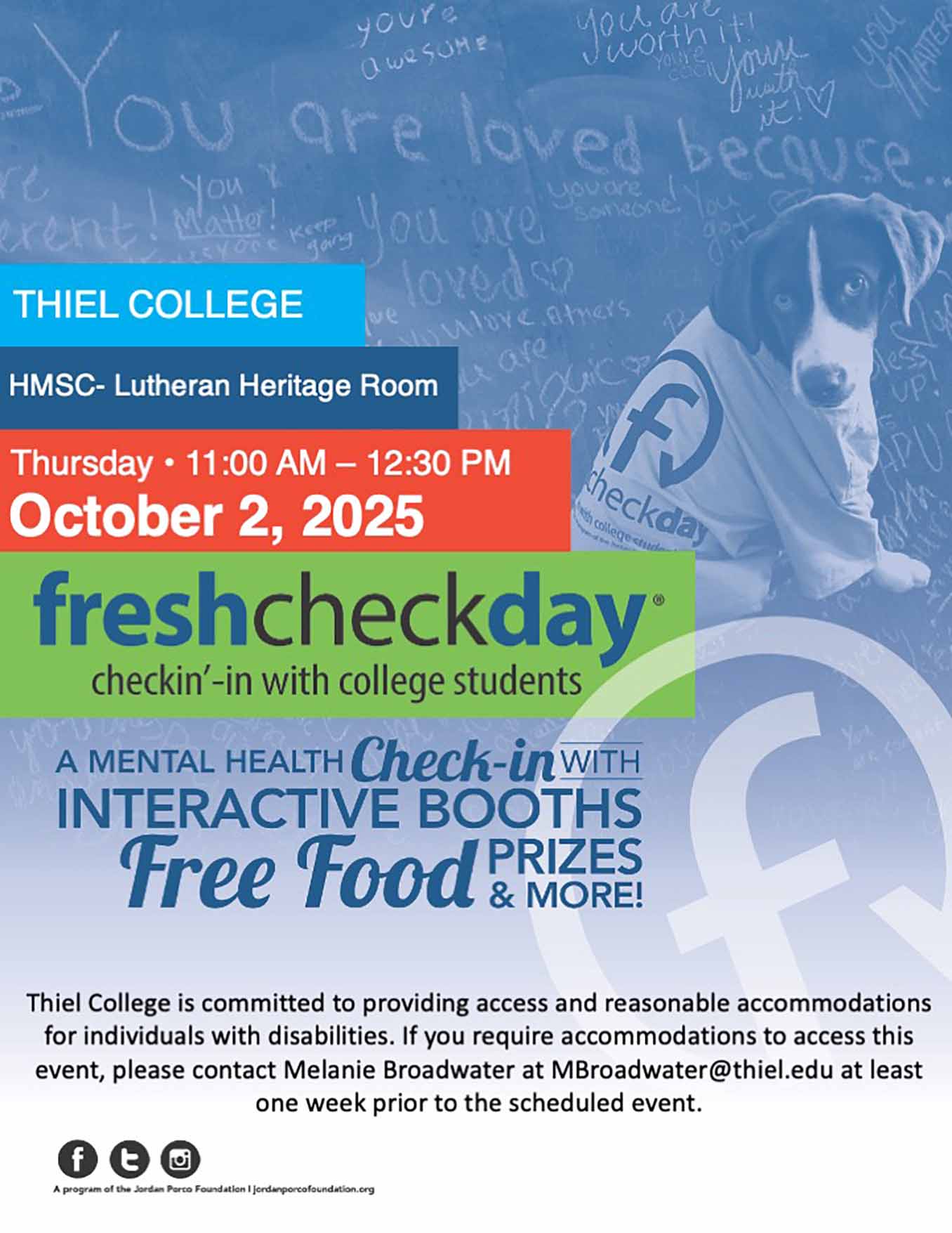 T-Notes is published Wednesdays during the academic year. Send your event or news to tnotes@thiel.edu by noon Monday, Oct. 6, 2025 to be published in that week’s edition. The next edition will be published Wednesday, Oct. 8, 2025.