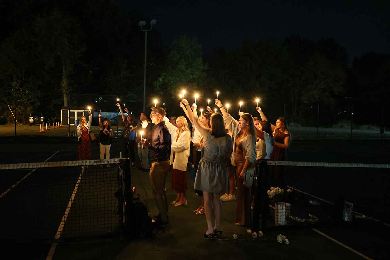 The Thiel Community came together on Sunday, September 21 at the William A. Passavant Center for a Service of Remembrance to honor the life of Toby Atwood ’26. President Susan Traverso, Ph.D. welcomed those in attendance and shared her own story about Toby. Other personal reflections and memories were shared by professors and students alike, including Atwood’s Zeta Tau Alpha sisters and Thiel Tennis teammates. Toby’s mother, Brandi Atwood, was the final speaker. The Thiel Choir also performed, and a video montage was played. Audra Franley ’17 (former Thiel pastor) concluded with a prayer/benediction. A candlelight procession to the Tomcat Tennis Courts followed where tennis coach Anthony Kobak shared some final thoughts and led a moment of silence.