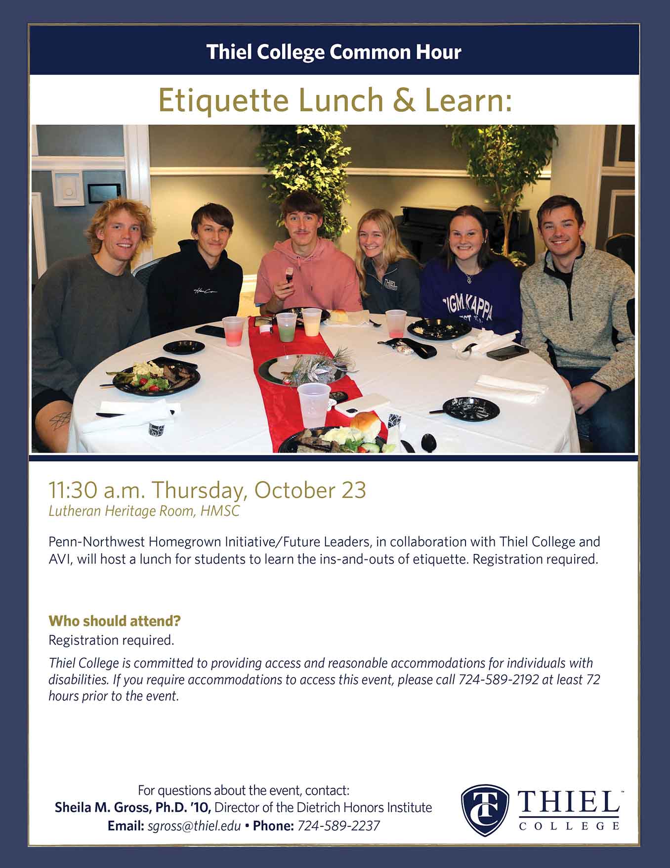 Penn-Northwest Homegrown Initiative/Future Leaders, in collaboration with Thiel College and AVI, will host an etiquette workshop and lunch. Registration required. Students should check their email for registration information.