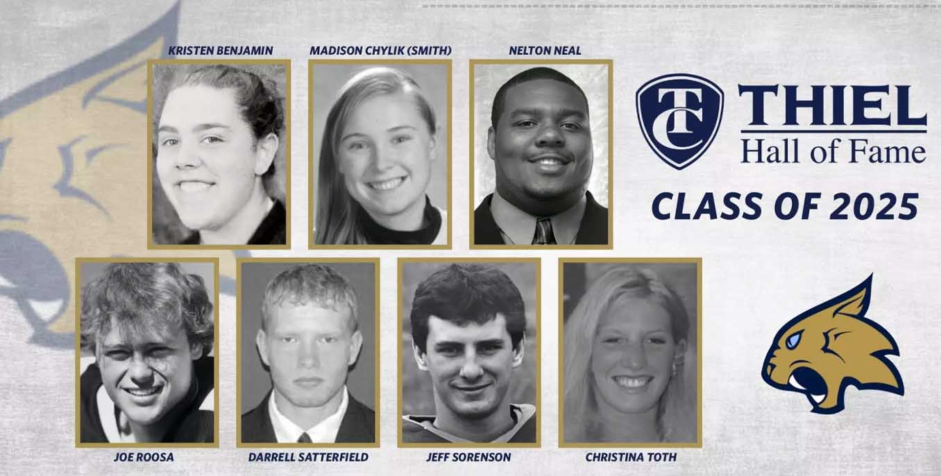 Thiel College athletics recently announced that Kristen Benjamin ’05, Madison (Chylik) Smith ’11, Nelton Neal ’06, Joseph Roosa ’80, Darrell Satterfield ’06, Jeffery Sorenson ’92, and Christina Toth ’01 will be inducted into the Thiel Athletics Hall of Fame.