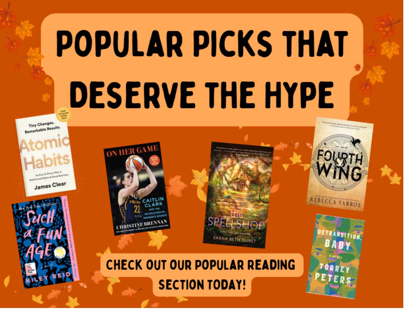 The staff at the Langenheim Memorial Library encourages faculty and staff members to stop by and check out their popular reading section.