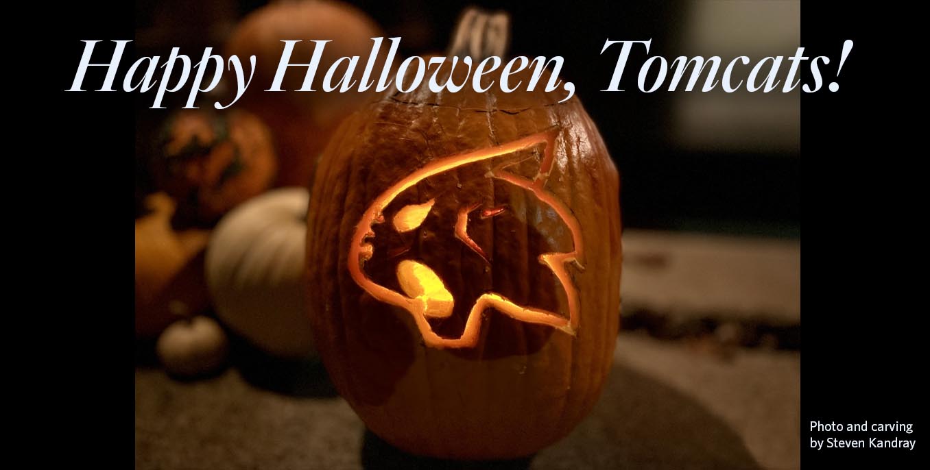 The Office of Communications and Marketing invites the campus community to contribute photo essays for the staff newsletter, T-Notes. The community’s submissions have offered glimpses into campus life, from vibrant 🍁 fall colors to festive moments like 🎅 Salvation Army bell ringers and 🎃 Halloween costumes. This week Assistant Professor of Business Administration & Accounting, Norman P. Mortensen H'81 Chair of Economics Steven Kandray carved a Halloween pumpkin to celebrate Tomcats and the season, in addition the Organization of Black Collegiates hosted a trunk-or treat event.