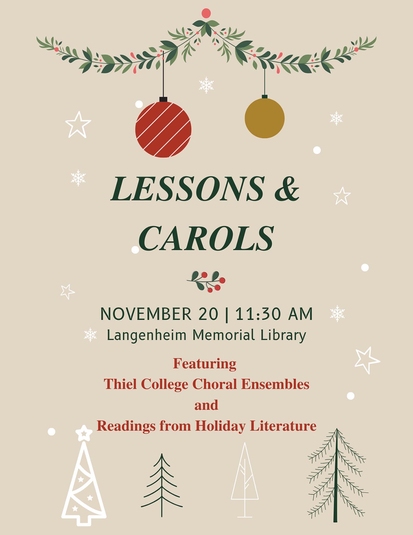 Thiel College will host a celebration of Lessons & Carols during Common Hour at 11:30 a.m. Thursday, Nov. 20, in the Langenheim Memorial Library. Choral ensembles, under the direction of Director of the Thiel Choir Brianne Samson, will perform holiday music, and students, staff and faculty will read literary selections that reflect the season. All are invited to help usher in the festive time of year with music and literature.