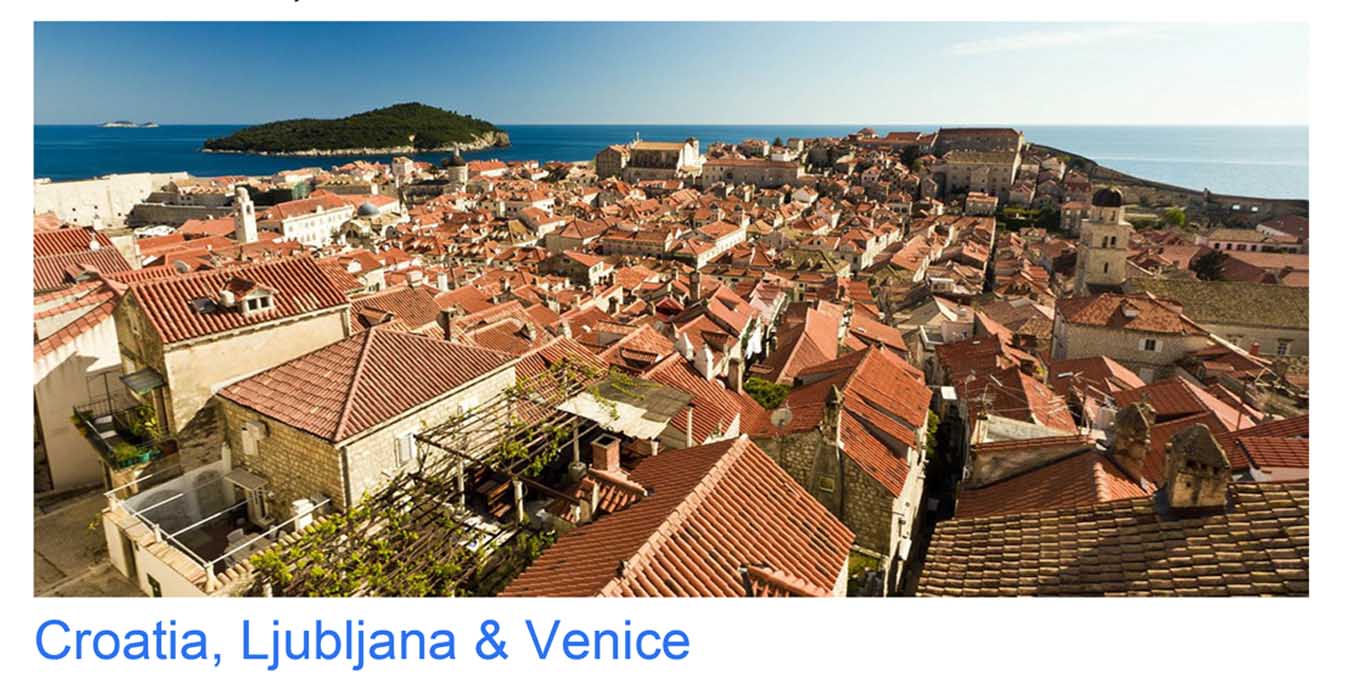 The May 18–27 travel abroad trip takes participants on a guided journey through Croatia, Slovenia and Italy, beginning in Dubrovnik and continuing through Split, Plitvice National Park, Ljubljana and Venice, with highlights including medieval city walls, Roman ruins, national parks and iconic European landmarks.